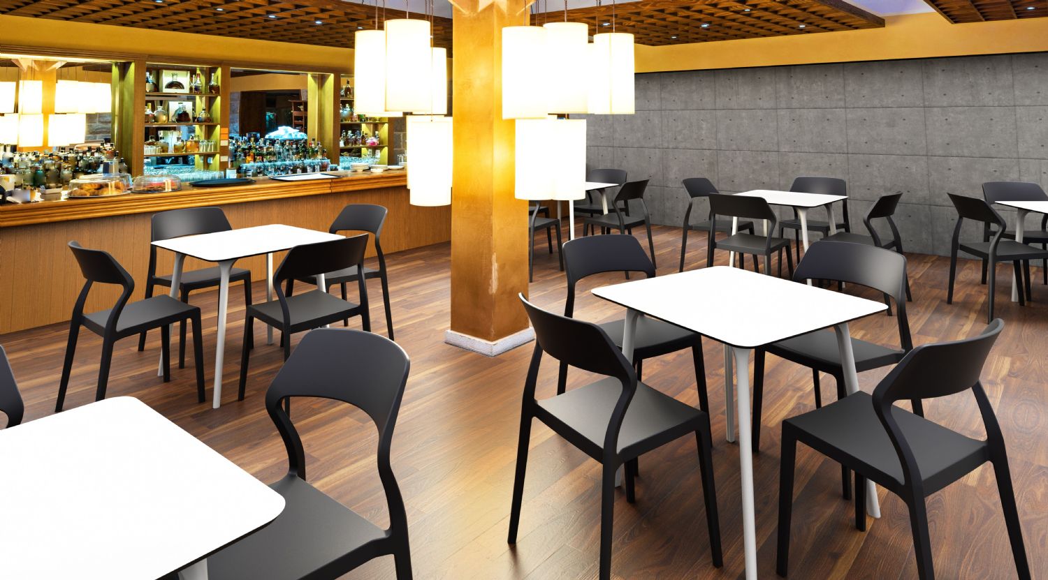 Snow modern indoor-outdoor dining chair. Made from commercial grade resin with gas injection molded legs. Features calm contemporary colors. It's very comfortable thanks to its wider and deeper than normal design and angled back support. So elegant that it is suitable for indoors, so durable that it is used outdoors. Perfect for heavy use areas. Great for outdoor spaces. Preferred by yogurt shops, outdoor cafes, ice cream shops, outdoor restaurants and hotels. Chairs are stackable, easy cleaning and UV resistant. Made for outdoor use.