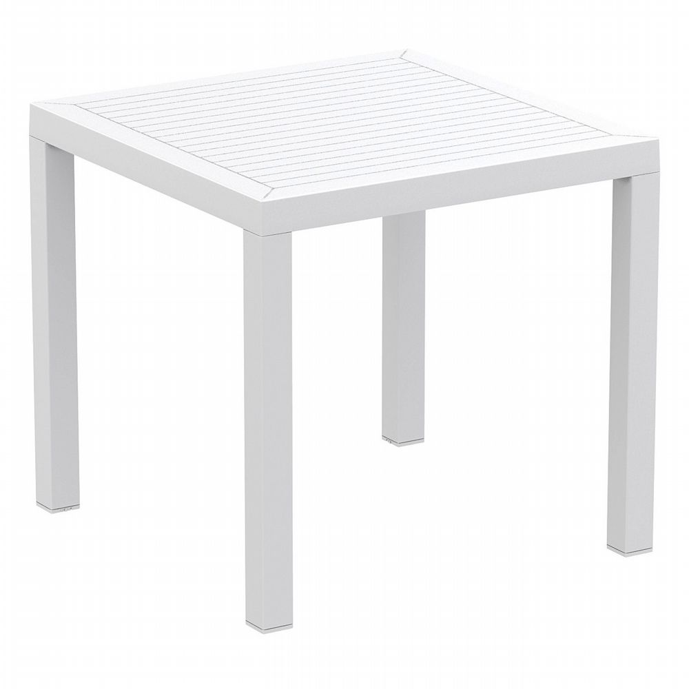 Air resin dining set with four chairs and one square table. Made for commercial durability. Chairs are stackable. UV treated. Hose down for cleaning. Withstands outdoor temperatures summer and winter. Table has levelers for uneven surfaces. No metal parts. Chairs are heavier than most resin chairs of its type. Dining set is perfect for heavy use areas. Set items are 100% resistant to outdoors, sun, snow, salt. Resin is virtually maintenance free.