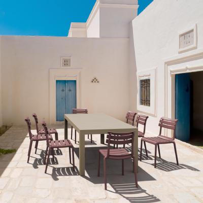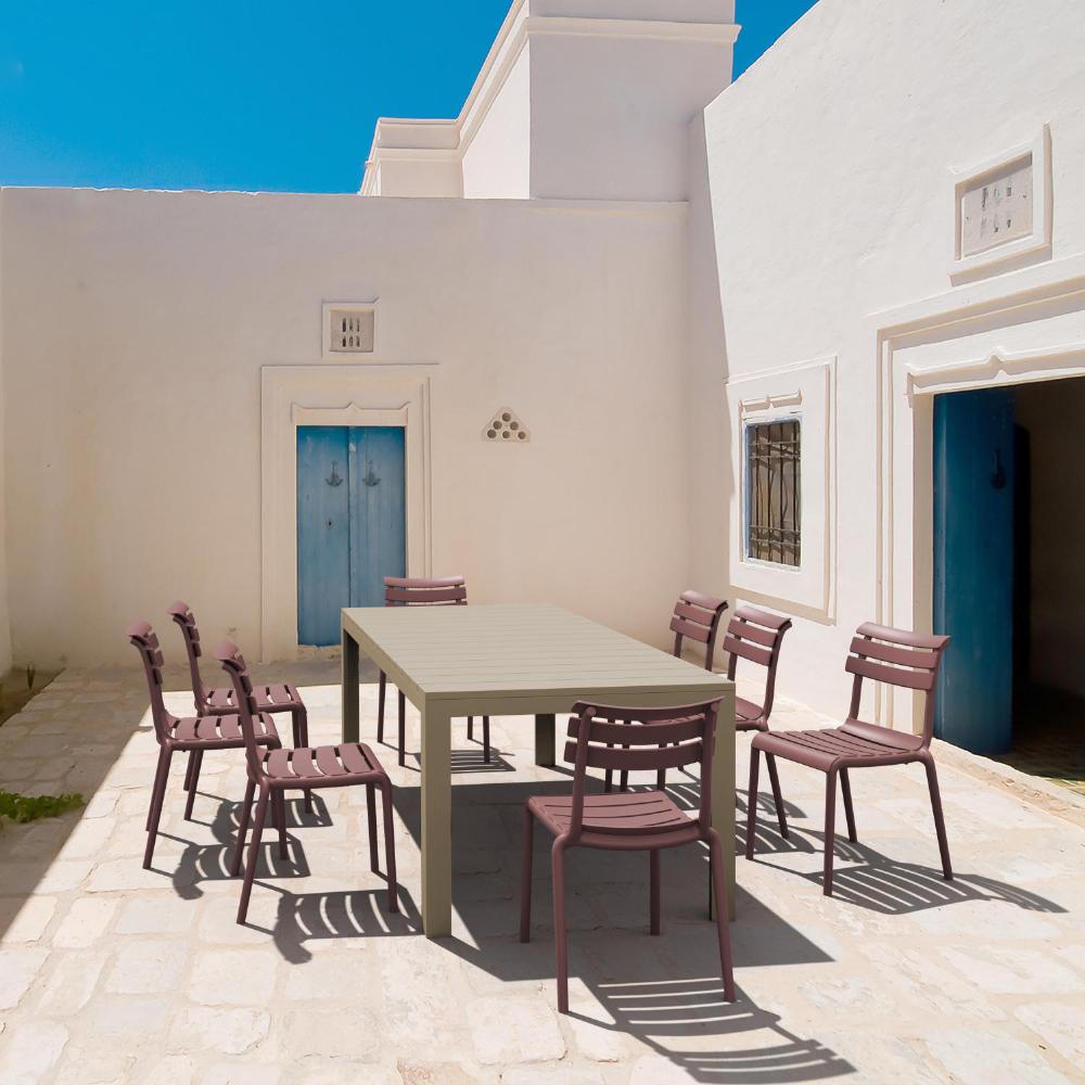 Helen 9 piece extendable dining set with eight chairs and one rectangle table. Chairs and table top made from marine grade polypropylene. Great for outdoor spaces, patios and decks. Used by restaurants, cafes and hotels.