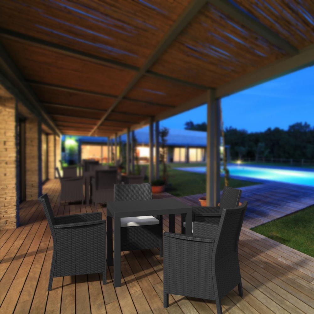 California Wickerlook resin dining set with four dining arm chairs and one 31 inch square dining table. Unlike any other woven furniture in the market Wickerlook furniture will never unravel. Chairs have no metal parts to rust, no moving parts that can break. Made for commercial durability. Perfect for home use or hotels and restaurants. UV treated. Hose down for cleaning. Withstands outdoor temperatures summer and winter. Chairs are 23 lbs and great for balcony use or in windy areas. Table doesn't have an umbrella hole. Chairs certified for strict European standards by CATAS Italian research institute and test laboratory.