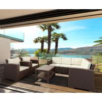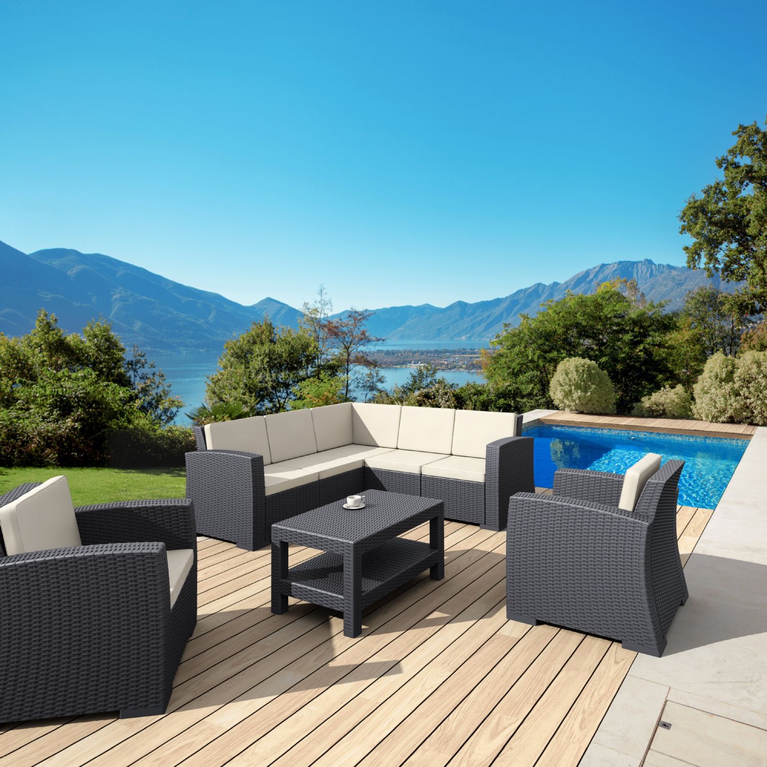 Monaco corner sectional with five piece set including cushions. Sectional includes one corner, one left arm, one right arm, two middle units. Wickerlook open weave design that resembles traditional woven wicker furniture. Will never unravel. Made for commercial durability. Perfect for hotels and restaurants. UV treated. Hose down for cleaning. No metal parts to rust, no moving parts that can break. Made for outdoors. Assembly required.