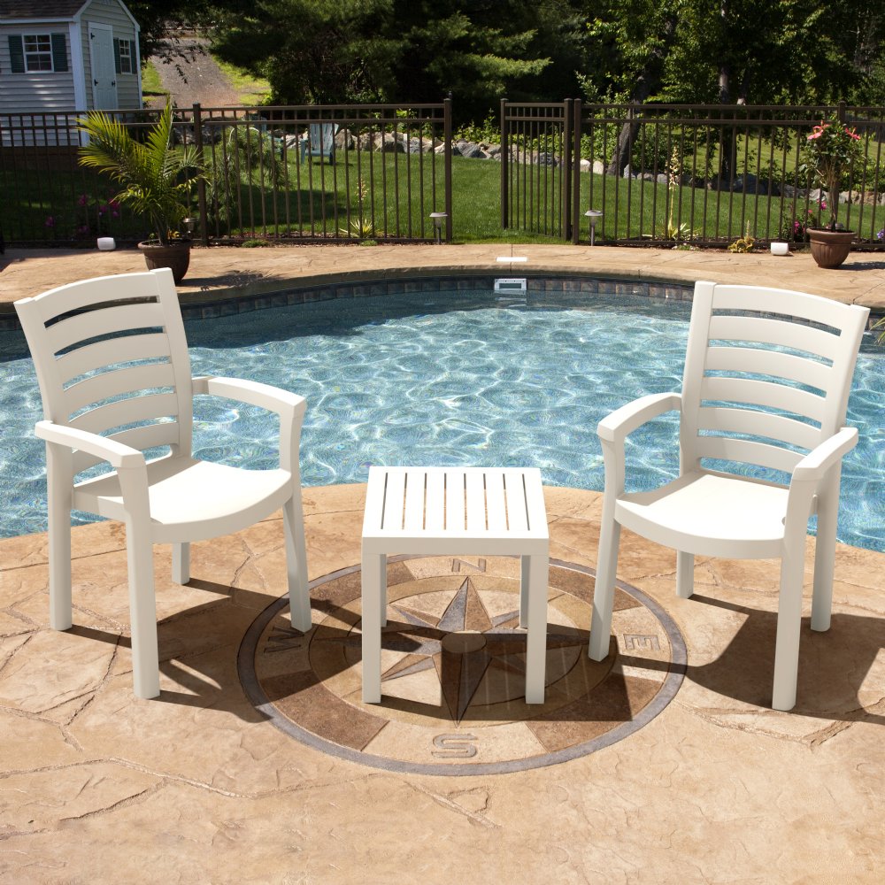 Marina arm chairs and Ocean side table 3 piece conversation set in white is stylish and comfortable set for your small outdoor space! Made from durable and weather-resistant polypropylene resin, this set is perfect for balconies, terraces, decks, rooftops and patios. Marina arm chairs feature a comfortable seat and backrest, making them the perfect choice for relaxing with a good book or enjoying a drink with a loved one. Two people can easily enjoy a refreshing drink together at Ocean side table.
