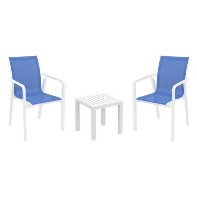 Pacific sling arm chairs and Ocean side table 3 piece balcony set in white and blue is stylish and comfortable set for your small outdoor space! Made from durable and weather-resistant polypropylene resin, this set is perfect for balconies, terraces, decks, rooftops and patios. Pacific sling arm chairs feature a comfortable seat and backrest, making them the perfect choice for relaxing with a good book or enjoying a drink with a loved one. Two people can easily enjoy a refreshing drink together at Ocean side table.