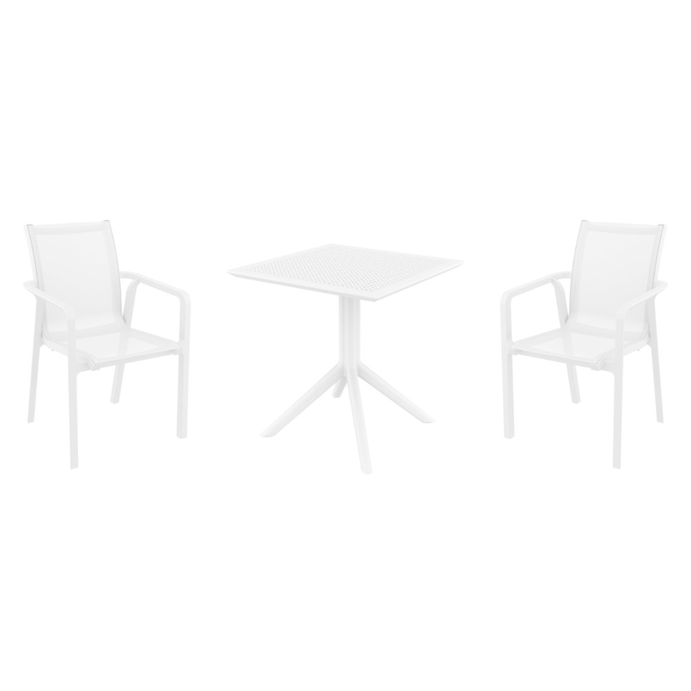 Introducing the Pacific sling arm chairs and Sky 27" square table 3 piece dining set in White - the perfect addition to any small outdoor living area! Crafted from high-quality polypropylene resin, this set is durable and weather-resistant, ensuring it will last you for years to come. Pacific sling arm chairs feature a sleek and modern design, with a comfortable seat and backrest. Sky 27" square table providing ample space for two people to enjoy a meal or drink together.
