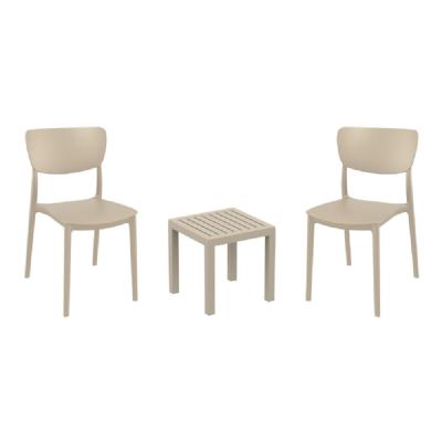 Monna chairs and Ocean side table 3 piece conversation set in taupe is stylish and comfortable set for your small outdoor space! Made from durable and weather-resistant polypropylene resin, this set is perfect for balconies, terraces, decks, rooftops and patios. Monna chairs feature a comfortable seat and backrest, making them the perfect choice for relaxing with a good book or enjoying a drink with a loved one. Two people can easily enjoy a refreshing drink together at Ocean side table.