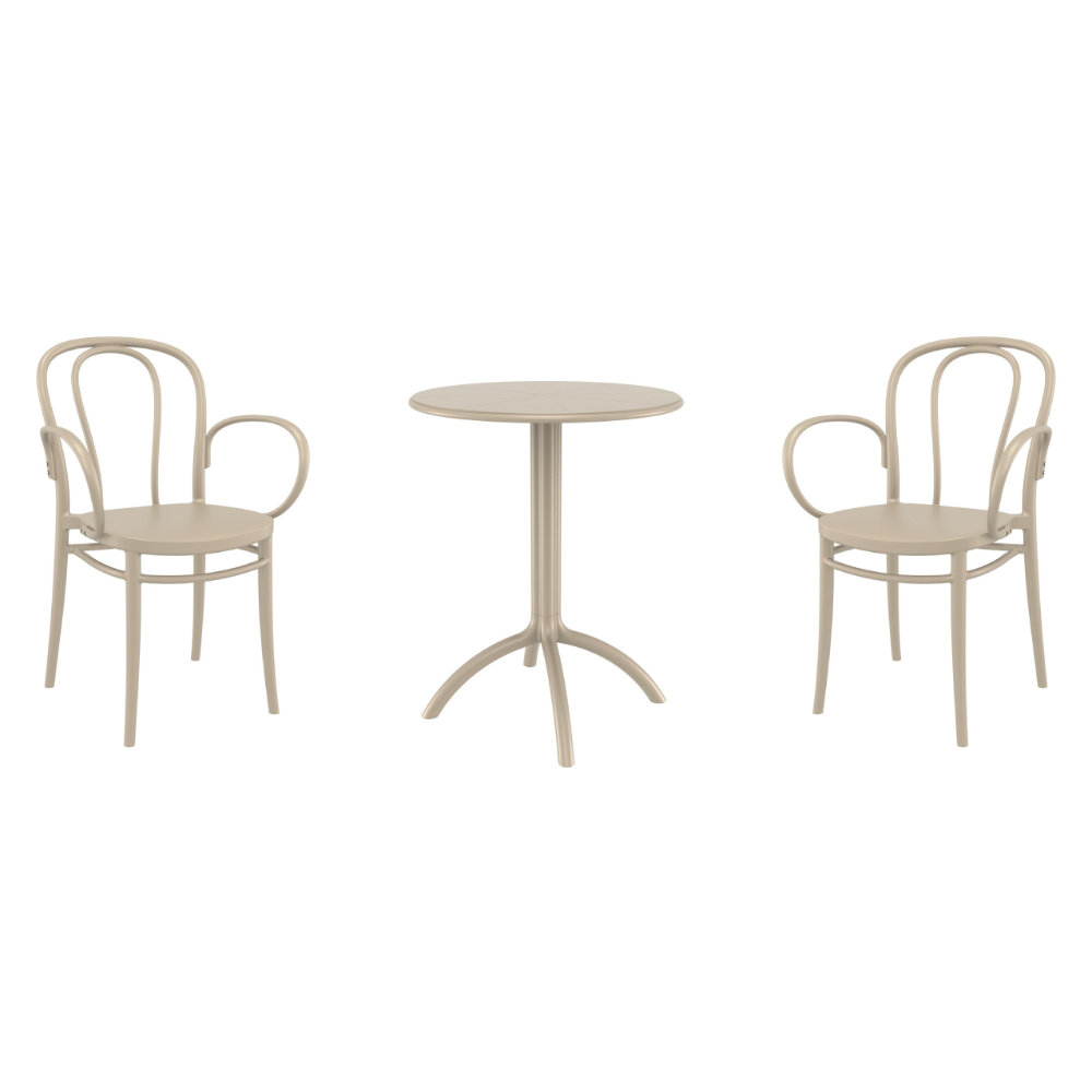 Transform your small outdoor area into a stylish space with Victor XL arm chairs and Octopus 24" round table 3 piece bistro set in taupe. Made from durable polypropylene resin, this bistro set is perfect for balconies, terraces, decks, patios, cafes and restaurants. Victor XL arm chairs feature a sleek and contemporary design that adds a touch of sophistication to any space. Octopus 24" round table provides plenty of room for two people to sit and enjoy a meal or drink together.